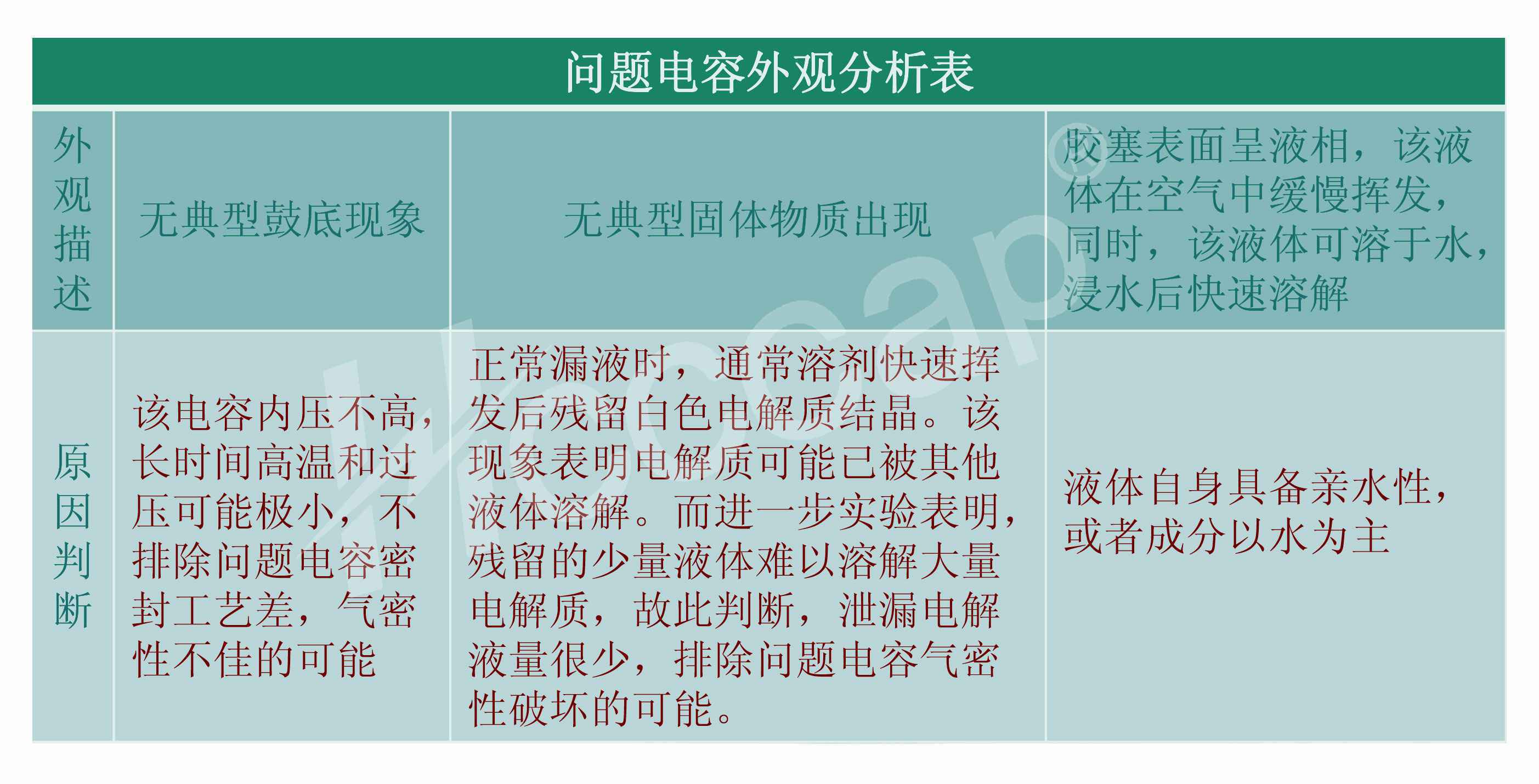 这也表明:正常电容表面洁净,在前2~3年往往不会出现“漏液”现象 ,该现象通常会在几年之后通过自然渗漏的累积才可能出现。