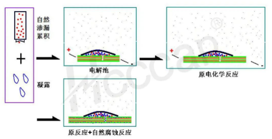 2. 焊盘与敷铜发生腐蚀后,PCB铜箔表面保护层破坏,在空气中继续形成自然腐蚀,该腐蚀自身会产生更多铜离子,并进一步吸收空气中的水汽,加速水汽在胶塞底部和PCB腐蚀点绿油涂层下累积。【自然腐蚀反应】